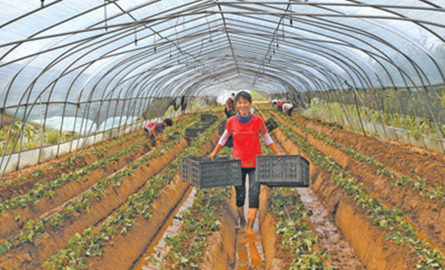 菏泽市高新区大力发展高效生态农业,优质草莓带动1000多人增收致富▼,亩均产值达5万元左右。图为马岭岗镇安顿庄村村民在草莓大棚作业。何 青摄(人民日报7月15日18版)