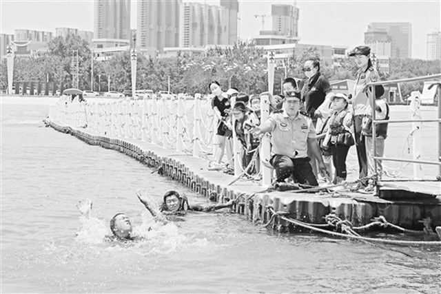 7月8日,烟台市公安局清泉寨海岸派出所联合专业救援队伍,在海边娱乐场所向游客开展防溺水安全宣传=。连日来,针对海边游客增多的实际,清泉寨海岸派出所民警通过开展巡逻防范◁△☆、强化警示提醒以及组织专业救援人员现场演示落水后如何开展救援和自救等方式,进一步提升游客们的安全意识和自救能力○▽。臧保东摄(工人日报7月14日6版)