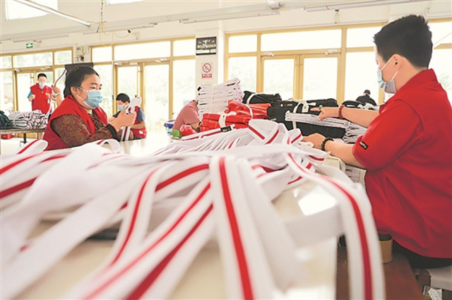 7月11日,青岛西海岸新区康源残疾人辅助性就业中心内,残疾人职工在工作台上忙碌-▲。 西海岸新区进一步推进残疾人辅助性就业☆▪■,通过对残疾人进行培训……=,让残疾人自食其力,既提高了残疾人的自信心,又减轻了其家庭负担。本报通讯员 王培珂摄(工人日报7月13日2版)