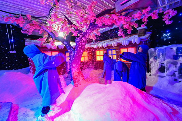 入伏首日,人们来到山东省青州古城景区室内冰雪世界,赏冰雕▪●▪、打雪仗、滑雪圈,乐享清凉●。新华社发(王继林摄)