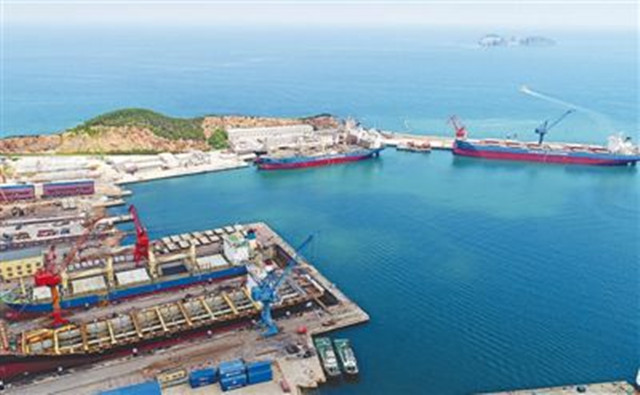 7月11日,位于山东省荣成市好运角旅游度假区的荣成新霞修船有限公司…◁,来自韩国、新加坡等国家,以及中国远洋等企业的多艘船舶停靠在码头进行维护保养△,一派繁忙景象。王福东摄(人民日报7月13日3版)